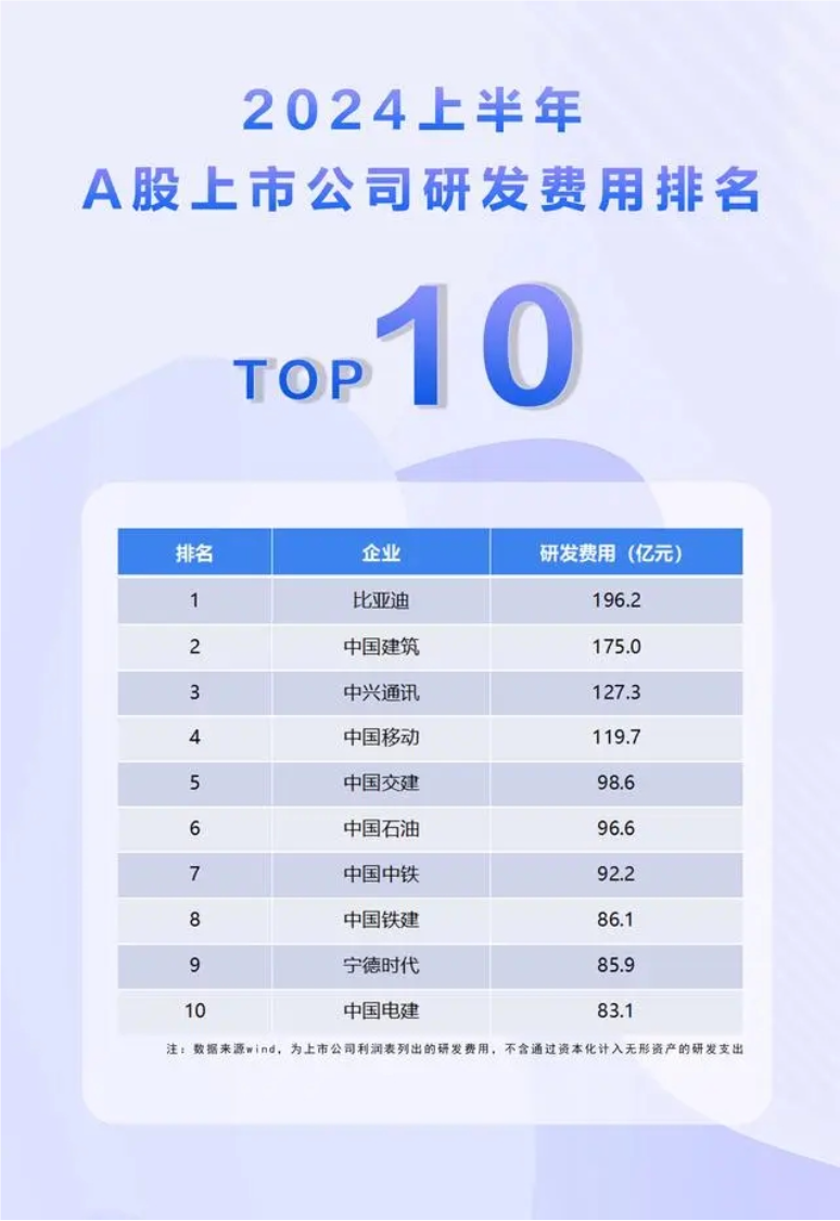 比亚迪如此高速增长的业绩得益于巨大的研发投入。Wind数据显示,在A股超5300家上市公司中,比亚迪研发费用排名第一,达202亿元,同比大增42%,创下历史新高,比同期净利润高66亿元。比亚迪始终坚持“技术为王,创新为本”的发展理念,从半年来看,比亚迪研发投入超特斯拉(161亿元),几乎等于长城汽车(63.8亿元)、理想汽车(60.8亿元)、吉利汽车(45.5亿元)、长安汽车(46.1亿元)之和。