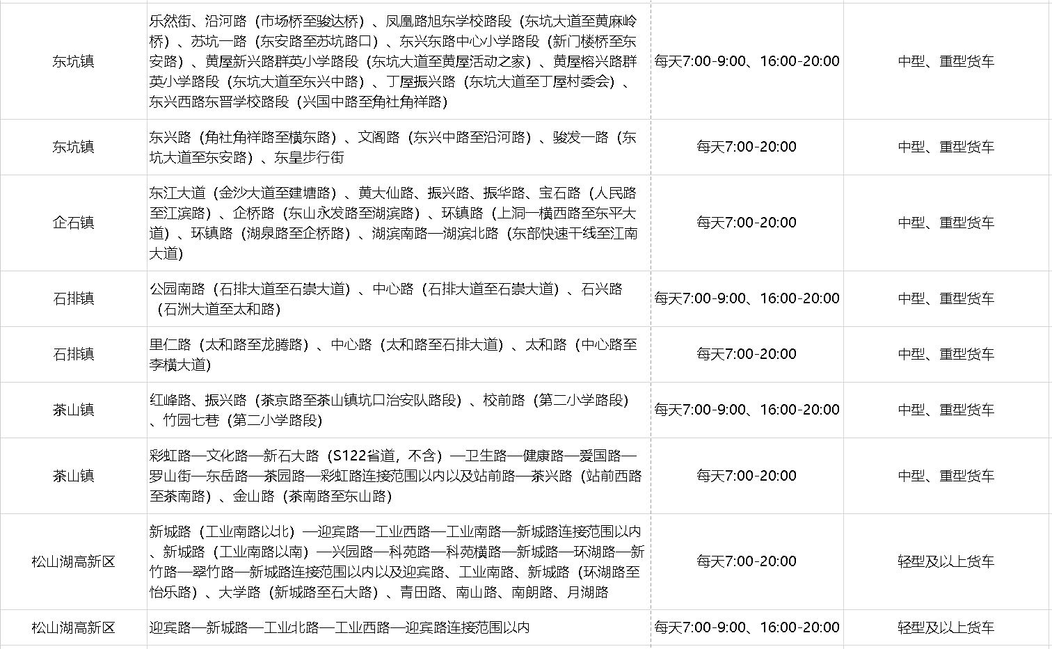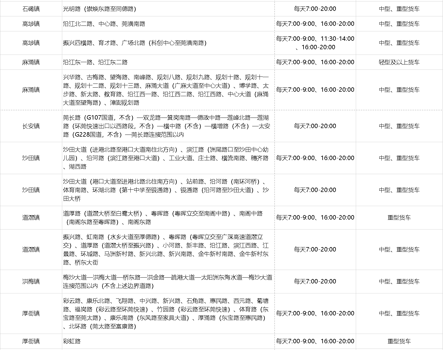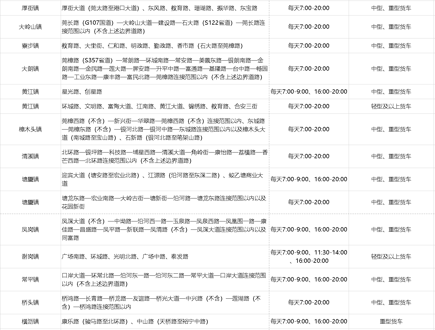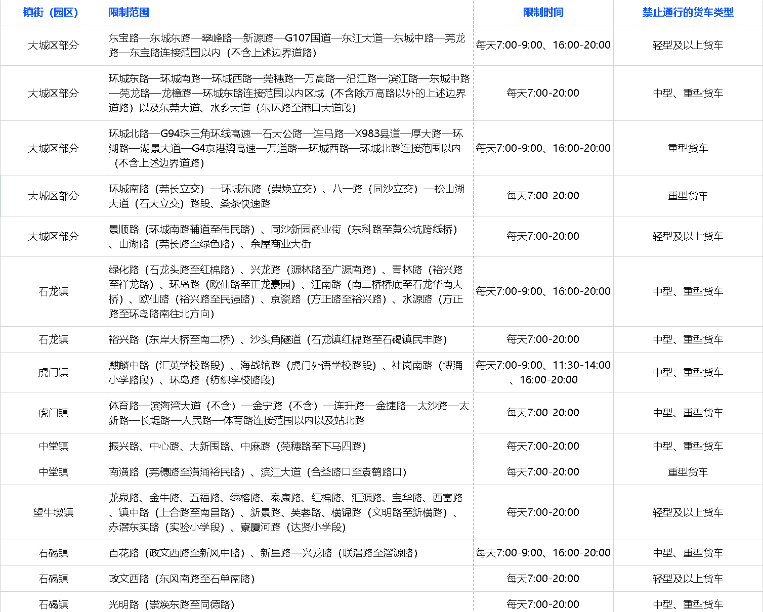 为优化交通组织,缓解道路交通拥堵,降低道路交通安全风险,东莞市自2024年11月1日起对各镇街(园区)的货车通行实施新的交通管制措施。以下为详细调整内容: