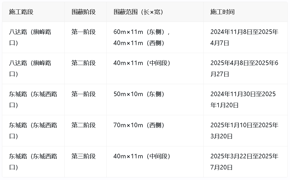- 第一阶段:2024年11月30日至2025年1月20日,围蔽东城西路口东侧,长50m。
