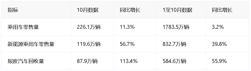 - 报废汽车回收量:10月,全国报废汽车回收87.9万辆,同比增长113.4%。1至10月,全国报废汽车回收584.6万辆,同比增长55.9%。