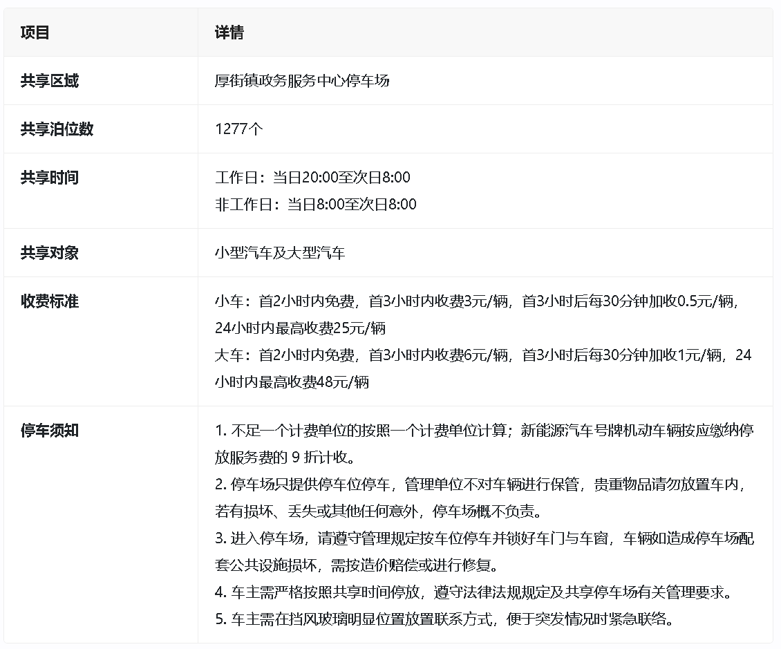 共享的停车场位于厚街镇政务服务中心,共享泊位1277个。共享时间为工作日当日20:00至次日8:00,非工作日则为当日8:00至次日8:00。共享对象包括小型汽车及大型汽车。收费标准根据《关于调整我市机动车停放服务收费有关问题的通知》(东发改〔2019〕468号)拟定,具体如下: