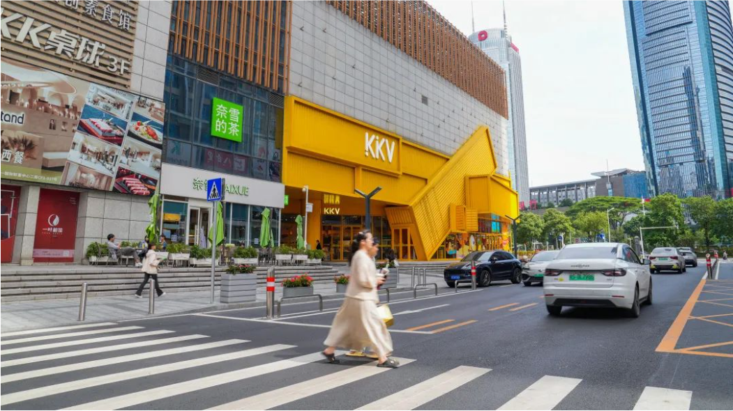升级后的人行步道不仅释放了更多的活动空间,还与周边的商业店铺形成了有机融洽的整体,使得街区的休闲和社交功能得到了大幅度释放。市民和游客可以更加轻松地走进咖啡店休憩或到购物中心购物,享受更加舒适的消费体验。此外,道路还重新组织了空间功能分区,设置了景观绿植花箱和城市家具,配合周边商家的环境营造,逐步形成了一个“花园式”的商业街区。
