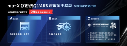mu-X牧游侠QUARK不仅以汽油车身份出道,更带来诚意十足的2年免息和抗疫善助计划(即日起至6月30日),包含服务无忧礼(3年6次免费保养)、里程无忧礼(3000元油卡)、国家地理科考礼。以虔诚之态,mu-X牧游侠QUARK让城市野望者从容出走,让游走世界者信步城市。