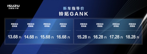 两款车型均配备业界领先的2.0T汽油超强动力、搭载豪华车专属采埃孚8AT自动变速箱,其中,铃拓GANK共推出8款车型,官方指导价13.68万-18.28万元;以独家大空间全感官智能座舱等制霸越野圈的mu-X牧游侠QUARK,共推出8款车型,官方指导价16.68万-22.08万元。