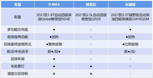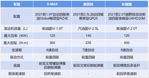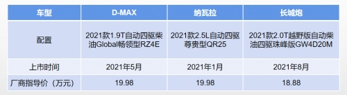 为了保证对比的公平公正,我们按照价格相近的原则,D-MAX选择的是2021款1.9T自动四驱柴油Global畅领型RZ4E(以下简称:D-MAX),官方售价为19.98万元;纳瓦拉选择的是2021款2.5L自动四驱尊贵型QR25(以下简称:纳瓦拉), 官方售价为19.98万元;长城炮选择的是2021款2.0T越野版自动柴油四驱珠峰版GW4D20M(以下简称:长城炮),官方售价为18.88万元。看谁在相同的价格下更有性价比?