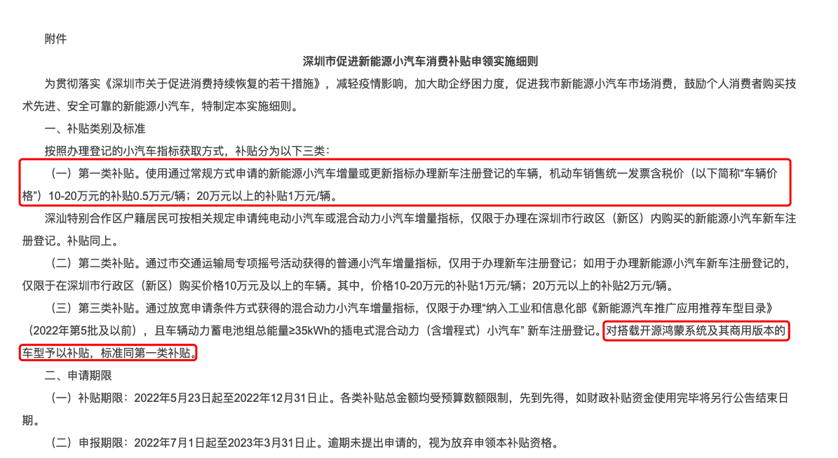 近日,《深圳市促进新能源小汽车消费补贴申领实施细则》(以下简称《细则》)正式印发,对三类在深汽车消费实施补贴,补贴期自2022年5月23日起至2022年12月31日止。其中第三类补贴明确指出:“对搭载开源鸿蒙系统及其商用版本的车型予以补贴,标准同第一类补贴。”,即每辆最高补贴1万元。