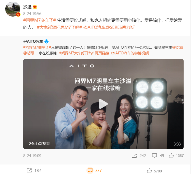 近日,AITO官方账号发布了演员沙溢及其家人试驾问界M7的视频。作为赛力斯汽车与华为联合设计的第二款产品,AITO问界M7凭借宽裕的空间、舒适的零重力座椅、HarmonyOS智能座舱等亮点,为沙溢、胡可带来了愉快舒心的驾乘体验,让这对明星夫妻体验到智慧出行的乐趣。