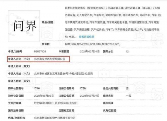 问界虽然是由华为和赛力斯共同推出的汽车品牌,但问界此前的商标所有者既不是华为,也不是赛力斯,而是一家第三方公司——北京永安世达科贸有限公司,而且这个第三方似乎并没有和华为、赛力斯有所关联。