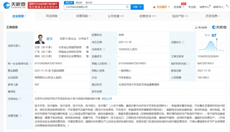 8月23日,天眼查App显示,近日,小米汽车科技有限公司登记备案“xiaomiev.com”网站域名。该公司成立于2021年11月,法定代表人为雷军,注册资本10亿人民币,经营范围包括技术开发、新能源车整车制造、汽车整车及零部件的技术研发、道路机动车辆生产等,由小米科技有限责任公司全资持股。