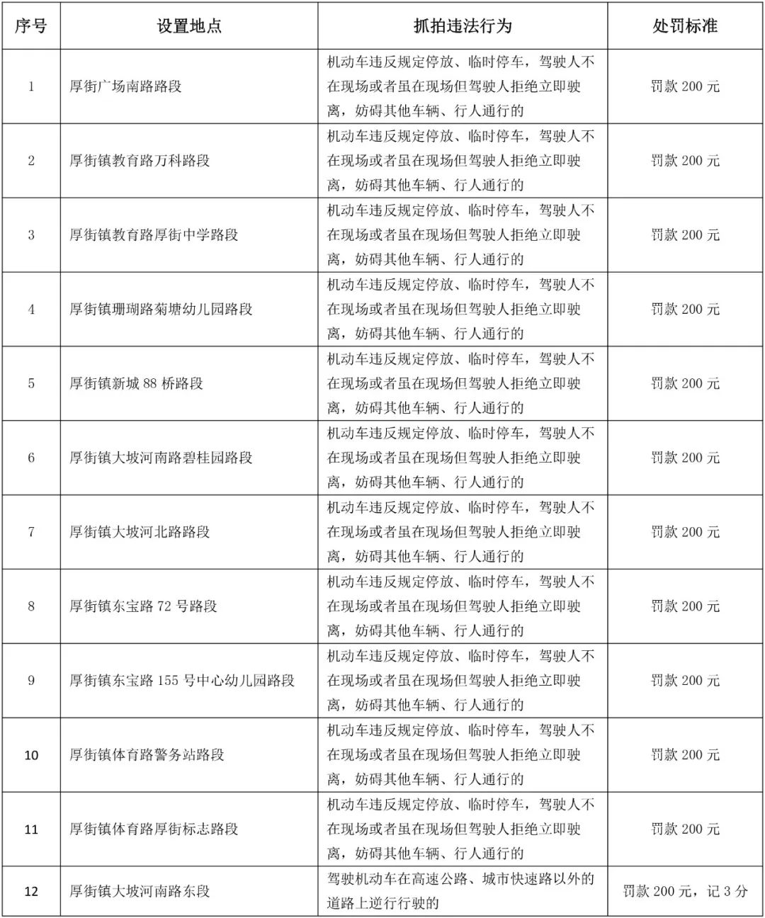 8月24日,厚街交警大队发布“关于新增电子警察设备的公示”(下称“公示”),“公示”称,为加强辖区道路交通管控,预防和减少道路交通事故发生,保障道路交通安全、畅通、有序,东莞市公安局交通警察支队厚街大队在厚街广场南路路段教育路万科路段、教育路厚街中学路段、珊瑚路菊塘幼儿园路段、新城88桥路段、大坡河南路碧桂园路段等12处路段新增电子警察设备,并于2023年9月1日零时起正式启用执法。