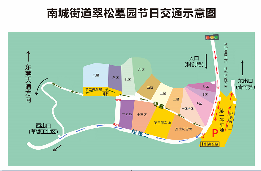 南城翠松墓园实行单向行驶,入口位于科创路,出口分别位于草塘工业区(西出口)、青竹笋小组(东出口)。