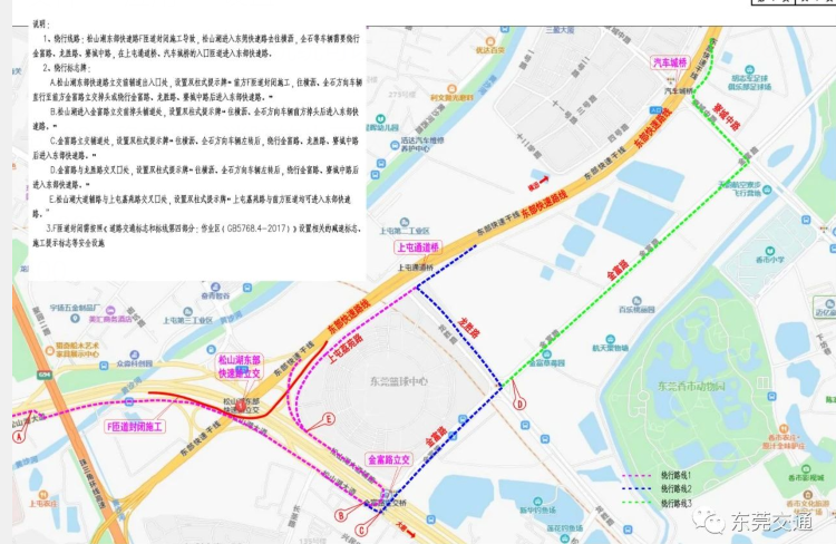1、松山湖至东部快速路立交前辅道出入口处:前方F匝道封闭施工,往横沥、企石方向车辆直行至前方金富路立交掉头或绕行金富路、龙胜路、寮城中路后进入东部快速路。