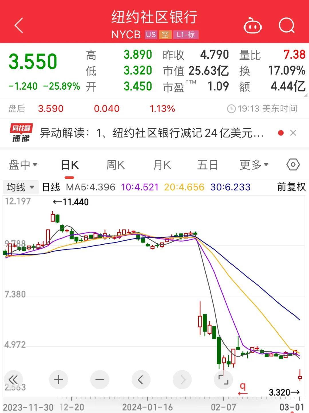 纽约社区银行是一家总部位于美国纽约州的商业地产贷款机构,由于商业房地产贷款损失,就在今年2月,纽约社区银行已发生过一次暴跌。当时,该行公布了远低于市场预期的财报:2023年四季度报亏2.52亿美元,而分析师此前预期盈利2.06亿美元;每股亏损0.36美元,同比由盈转亏。