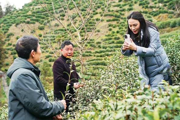近日,林红梅(右)在安康市紫阳县城关镇一处茶山上拍摄记录茶园春管情况。林红梅从2015年开始在陕西省安康市紫阳县创办电商公司,从销售环节不断拓展,逐渐参与到加工生产当中,助力紫阳县及周边地区特色农产品产业发展,至今已累计销售2.17亿元。