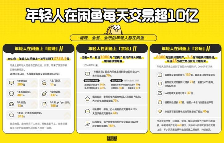 作为年轻人践行绿色生活的闲置交易社区,目前闲鱼拥有5亿用户,其中“95后”占比最多,2023年有3000万“95后”新用户涌入闲鱼。来到闲鱼的年轻人带来了多元的交易形态和丰富的供给,为闲鱼注入新的生机和活力。