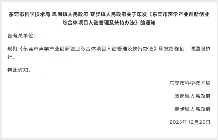 对发展势头良好,对声学产业有引领作用的科技型企业给予奖励,入驻后首次通过或重新通过认定的国家高新技术企业,在省、市、镇奖励基础上叠加给予一次性3万元奖励;对新认定为东莞市百强创新型企业和瞪羚企业的,在省、市、镇奖励基础上,分别叠加给予一次性20万元、10万元奖励,每家企业获得产业发展奖励累计最高不超过50万元。
