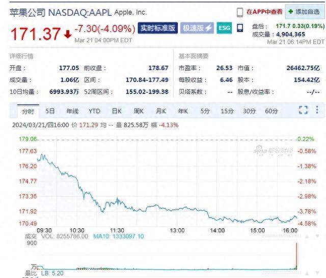 当地时间3月21日,苹果低开低走,收跌4.09%,报171.37美元,创2023年8月4日以来最大单日跌幅,其市值一夜蒸发超1100亿美元(约合人民币8000亿元),最新市值2.6万亿美元。