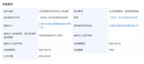 此次股权冻结的期限自2024年3月20日至2027年3月19日,执行法院为江苏省扬州市邗江区人民法院。