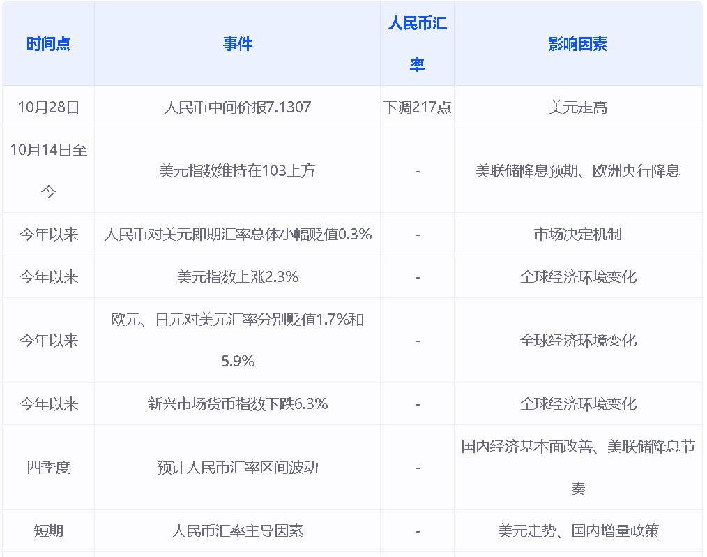 随着全球经济环境的变化,人民币汇率近期出现了一些波动。10月28日,中国人民银行授权中国外汇交易中心公布的数据显示,人民币中间价报7.1307,较前一交易日下调217点。专家们普遍认为,美元的走强是导致人民币对美元汇率被动贬值的主要原因。Wind数据显示,自10月14日美元指数升至103.1953后,至今一直维持在103上方。