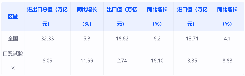 今年前三季度,全国自贸试验区进出口总值达到了6.09万亿元人民币,同比增长11.99%。其中,出口值为2.74万亿元,增长16.10%;进口值为3.35万亿元,增长8.83%。这一增速明显高于全国平均水平,前三季度全国进出口总值为32.33万亿元,同比增长5.3%。其中,全国出口总值为18.62万亿元,增长6.2%;进口总值为13.71万亿元,增长4.1%。