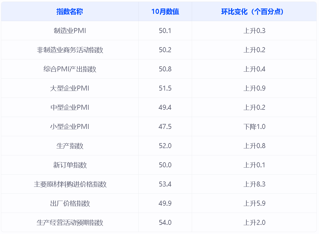 国家统计局服务业调查中心和中国物流与采购联合会发布的数据显示,10月制造业采购经理指数(PMI)、非制造业商务活动指数和综合PMI产出指数分别为50.1%、50.2%和50.8%,较上月分别上升0.3个、0.2个和0.4个百分点,三大指数均位于临界点以上。制造业PMI时隔5个月重返扩张区间。