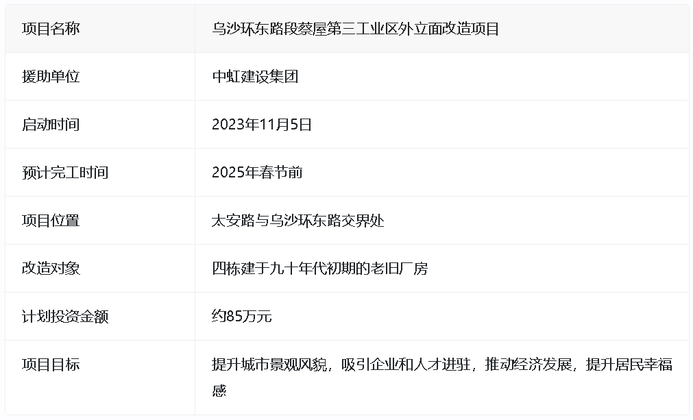 根据《东莞市关于引导建筑业企业投身“百县千镇万村高质量发展工程”的行动方案》,长安镇住房和城乡建设局积极推动下,中虹建设集团与乌沙社区结对,决定出资对乌沙环东路段蔡屋第三工业区外立面进行改造。该项目位于太安路与乌沙环东路的交界处,邻近裕鑫研发中心,改造对象为四栋建于九十年代初期的老旧厂房。