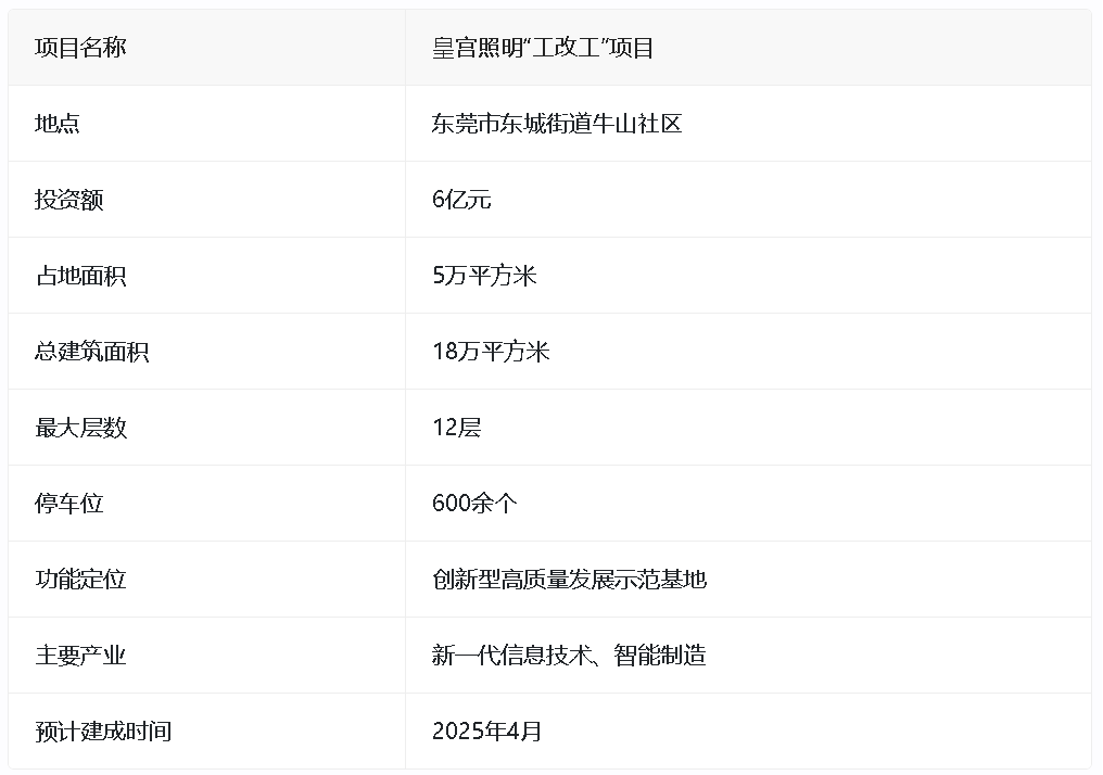 东莞市东城街道牛山社区的皇宫照明“工改工”项目近日全面封顶,标志着该社区在推动高质量发展方面迈出了重要步伐。该项目是东莞市2023年重大项目之一,总投资6亿元,占地面积5万平方米,总建筑面积18万平方米,预计2025年4月建成并投入使用。