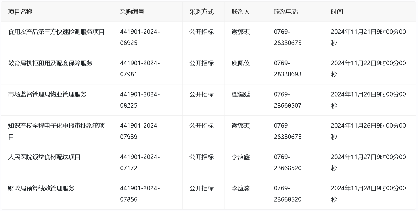 日,东莞市公共资源交易中心发布了多项政府采购项目,涵盖了食用农产品检测、教育局机柜租用、市场监督管理局物业管理、知识产权电子化申报审批系统、医院饭堂食材配送以及财政局预算绩效管理服务等多个领域。这些项目通过公开招标的方式进行,旨在提高公共服务效率和质量。