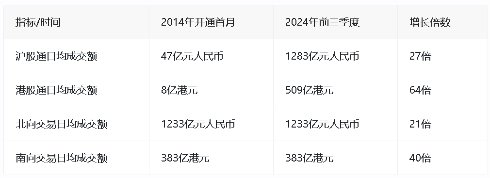 港交所发布的《内地与香港资本市场互联互通十周年白皮书》显示,截至2024年9月底,沪深港通下合资格股票超过3300只,已覆盖沪深港三地市场上市公司总市值的九成和成交规模的八成以上。2024年前三季度,北向和南向交易的日均成交额分别为1233亿元人民币和383亿港元,与2014年开通首月相比,分别增长21倍和40倍,已占到内地市场成交总额的6.7%和香港市场成交总额的16.9%。