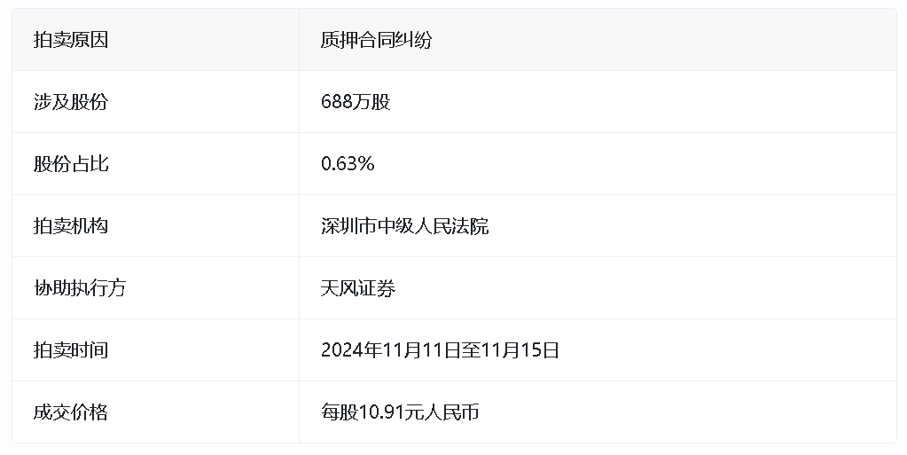 近日,TCL智家(002668)发布公告称,公司持股5%以上的股东武汉株信睿康因质押合同纠纷,所持有的688万股TCL智家股份(占总股本的0.63%)被深圳市中级人民法院裁定进行变价、拍卖、变卖。天风证券作为执行程序协助方,于2024年11月11日至11月15日通过集合竞价交易模式成功售出全部股份,平均成交价格为每股10.91元人民币。
