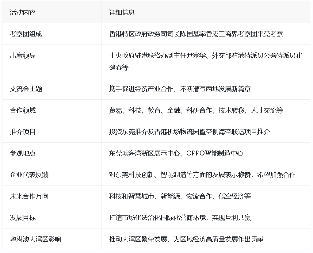 在参观东莞滨海湾新区展示中心和OPPO智能制造中心后,香港工商界考察团的企业代表们对东莞近年来的科技创新和智能制造发展给予了高度评价,并表达了进一步加强经贸合作、推动更多项目在东莞落地转化的愿望。