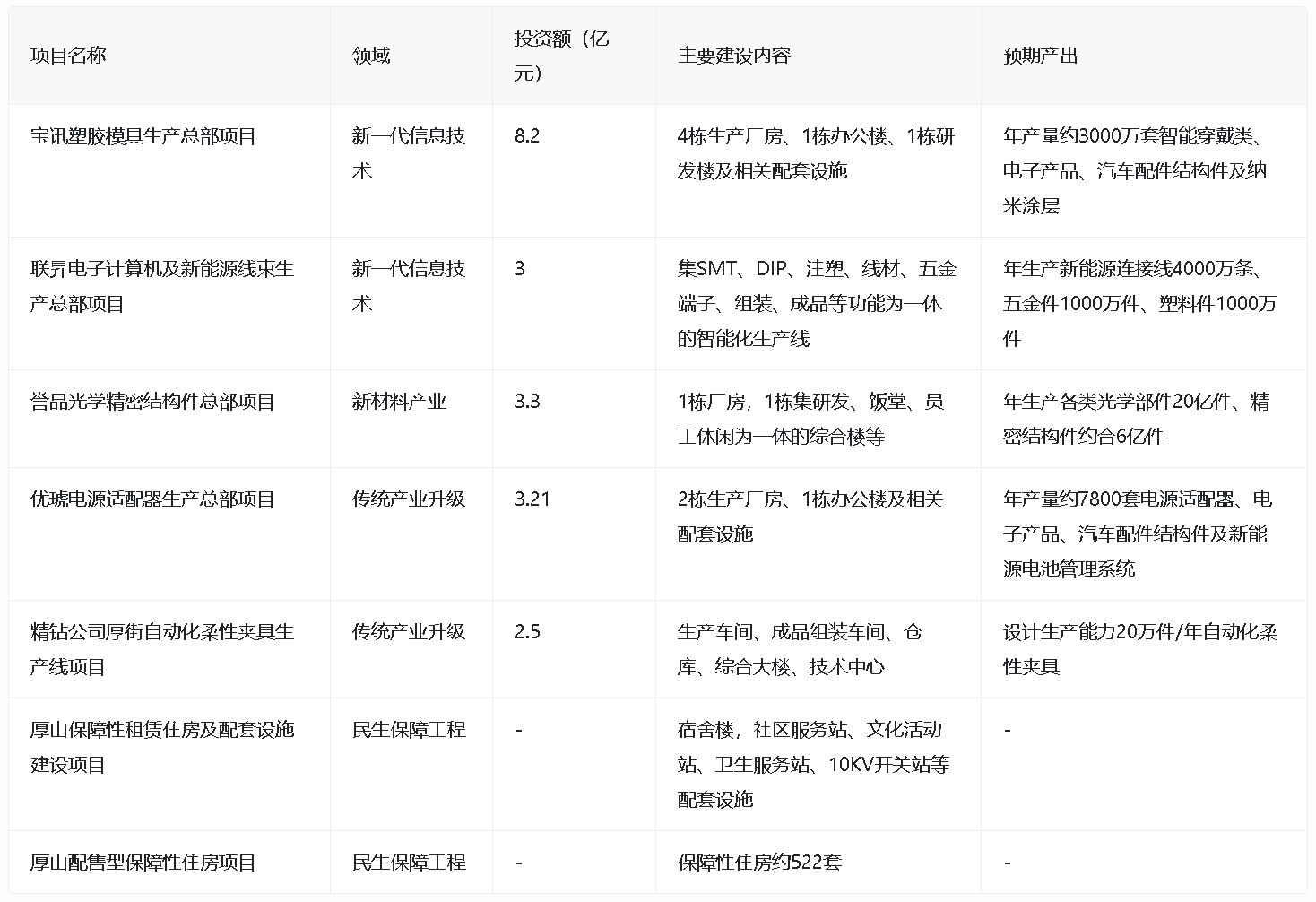 - 优琥电源适配器生产总部项目:总投资3.21亿元,将建设2栋生产厂房、1栋办公楼及相关配套设施,主要从事电源适配器、电子产品的结构件、汽车配件结构件及新能源电池管理系统的研发、生产和销售,预计年产量约7800套。
