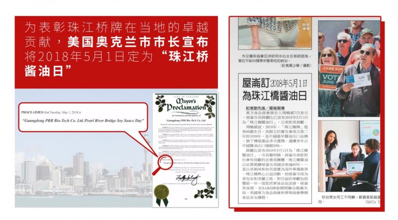 珠江桥牌以“一酱成菜”系列已成功登陆北美市场,并在加拿大等地迅速获得了消费者的广泛好评。其响应“一带一路”倡议加速布局,在俄罗斯推出固体酱油“酱油膏”,以爆款单品巩固中国调味品在俄罗斯的地位。旗下产品畅销100多个国家和地区,荣获了多项国际殊荣2004年摘得欧洲食品饮料新千年奖金奖(法国),2005年入选美国《卓越品牌年鉴》,2010年登陆巴黎食品博览会创新产品集,2011年荣获最受厨师喜爱的调味品(中国),2012年荣获母亲至爱健康美味酱油(中国香港),2014年亚洲品牌500强,2018年荣获EatWell杂志Yummies奖(澳洲),2023年被认定为中华老字号。2018年5月1日,美国奥克兰市长将当日定为“珠江桥牌日”,以表彰珠江桥牌在饮食文化交流方面的卓越贡献,让“中国制造”的匠心精神香飘海外。
