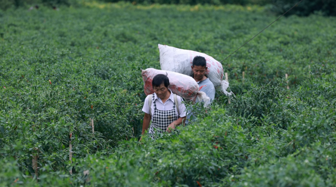 在柏果村务工的村民吴廷彩对此深有感触:"现在每天骑电动车10分钟来采椒,按斤计酬5角钱一斤,手脚麻利的一天能挣300多块。"基地落地三年来,已累计流转天星、红木等村400亩闲置土地,发放务工工资40余万元,带动5000余人次就近就业。63岁的田景秀老大娘笑称:"在家门口编辣椒筐,一个月也能赚千把块零花钱。"