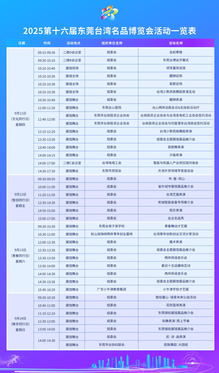 即将于2025年9月11日至14日在东莞举行的第十六届东莞台湾名品博览会(以下简称“台博会”)预计将成为两岸经贸文化交流的一大盛事。本届台博会以“六新”特色为引领,全面升级展会体验,旨在促进莞台深度融合与高质量发展。