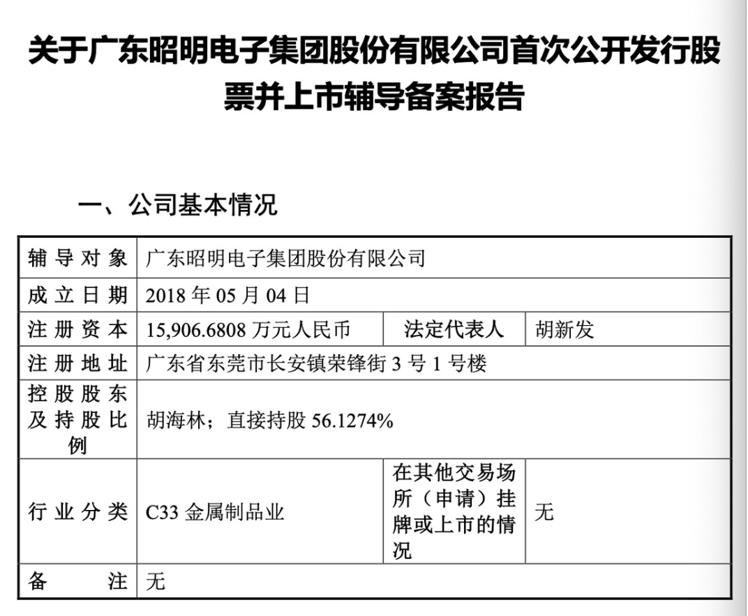 广东昭明电子集团股份有限公司近日与申万宏源证券承销保荐签署了辅导协议,正式启动首次公开募股(IPO)进程。该公司成立于2018年5月,位于东莞长安,是一家专注于精密金属五金全制程的省级专精特新企业。昭明电子注册资本1.59亿元,由胡海林控股,胡新发担任法定代表人。