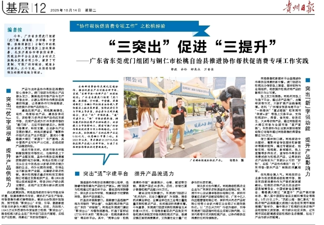 虎门组团与松桃自治县充分借助线上渠道、媒体矩阵与会展经济,提升松桃农特产品的影响力。依托“广州福宝贸易电商平台”等线上交易平台,支持松桃茶叶、鸡蛋、食用油等产品通过网络面向大湾区市场与全国市场“直产直销”。同时,通过中央媒体、《贵州日报》、《南方日报》等媒体矩阵,宣传协作帮扶促消费成效,让帮扶的农产品转变为广东群众认可的“好物”。