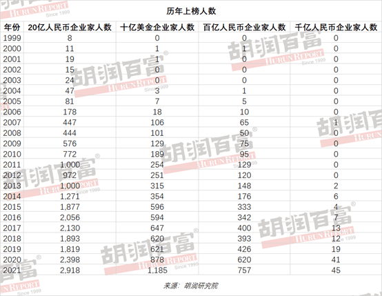 “以前我们认为每找到一位上榜企业家,应该还漏了两位,现在这一比例有所降低,今年我们找到了近 3,000 人财富超过 20 亿,而我们认为还漏了 4,000 来个人。”