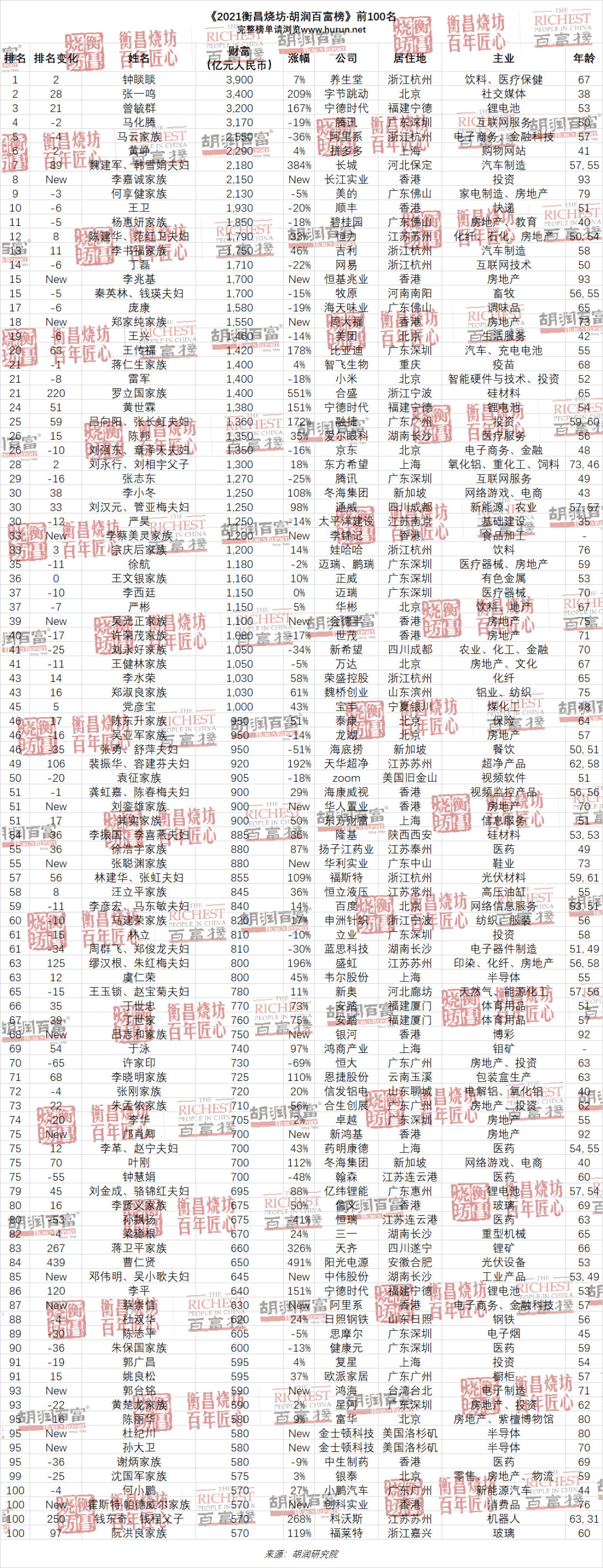 《2021胡润百富榜》发布:钟睒睒以3900亿元首次成为中国首富