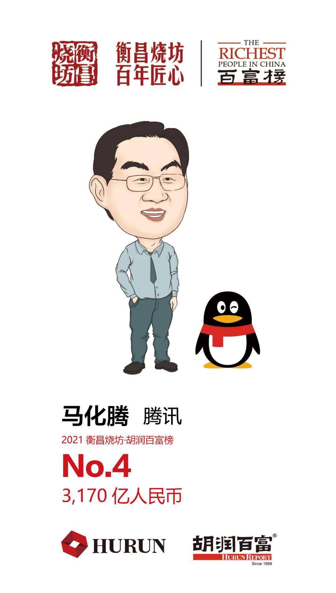 50 岁的马化腾财富比去年下降 730 亿元,即 19%,以 3,170 亿元位列第四,比去年下降 2 位。对比今年最高峰时,马化腾财富下降了 1,600 多亿。腾讯市值今年 2 月中旬一度逼近 6 万亿元,但随后持续下滑,目前市值 3.6 万亿元。去年全年腾讯营业收入达 4,821 亿元,同比增加 28%;今年上半年腾讯归母净利润同比增长 46%,主要来自网络游戏和金融科技板块的增长。腾讯今年受到国家对于网络游戏和视频点播等业务的一些政策限制。在投资方面,腾讯依旧收益颇丰,持有 Snap 和美团等高科技公司的股份,据不完全统计,腾讯去年通过其所持大约 100 家上市公司的股权总计能获得约 8,000 亿元的收益。腾讯位列今年胡润世界 500 强第六名。马化腾以 2 亿元的捐赠额位列今年胡润慈善榜第 16 位。腾讯今年共有 6 位股东上榜。