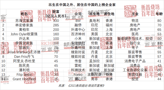 “今年榜单上有 14 位出生在中国之外、居住在中国的企业家们,其中 4 位来自新加坡,还有各 2 位来自印尼和丹麦,等等。”