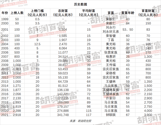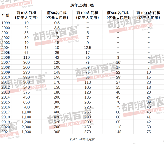 今年是胡润研究院自 1999 年以来连续第 23 次发布“胡润百富榜”,上榜门槛连续第九年保持 20 亿元。上榜企业家财富计算的截止日期为 2021 年 9 月 15 日。