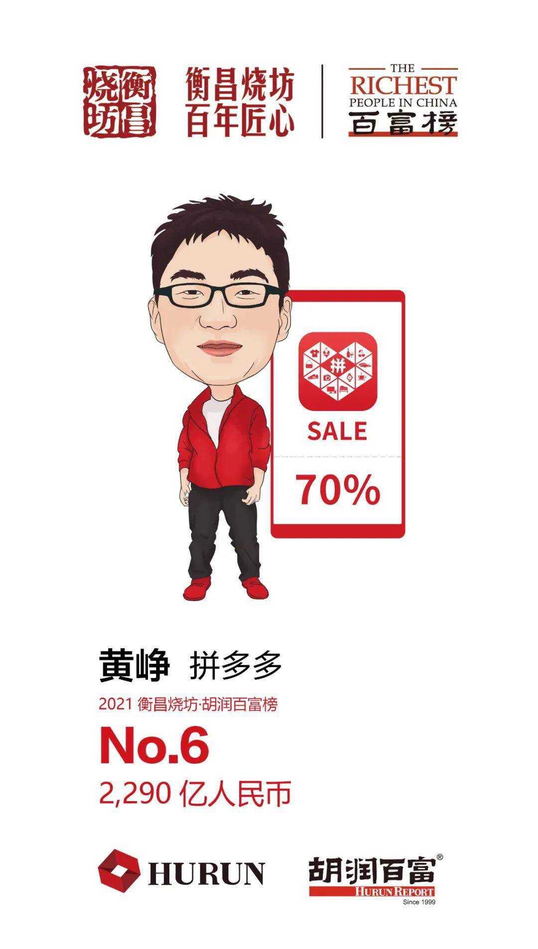 41 岁的黄峥财富比去年增长 90 亿元,以 2,290 亿元位列第六,比去年上升两位,但比今年最高峰时还是下降了 2,000 多亿。今年 3 月黄峥辞去拼多多董事长职务,表示将专注于食品科学和生命科学领域,为十年后的拼多多探索高速高质量纵深发展的新空间。与此同时,黄峥及其团队设立的繁星公益基金会将在未来三至五年向浙江大学教育基金会捐助超过 6 亿元,推动浙江大学在生物、医疗、农业、食品等多领域交叉方向展开基础研究及前沿探索。拼多多去年全年实现营收 595 亿元,同比增长 97%。拼多多位列今年胡润世界 500 强第 93 名。黄峥今年首次成为中国首善,以 120 亿元的捐赠额位列胡润慈善榜榜首。