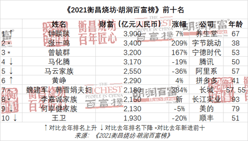 前十名中 4 位新人:今日头条的张一鸣、宁德时代的曾毓群、长城汽车的魏建军、韩雪娟夫妇和长江实业的李嘉诚家族。前十名门槛为 1,930 亿元,比去年的 2,000 亿元下降 70 亿元。前十名平均年龄 58 岁,比去年年长 4 岁。
