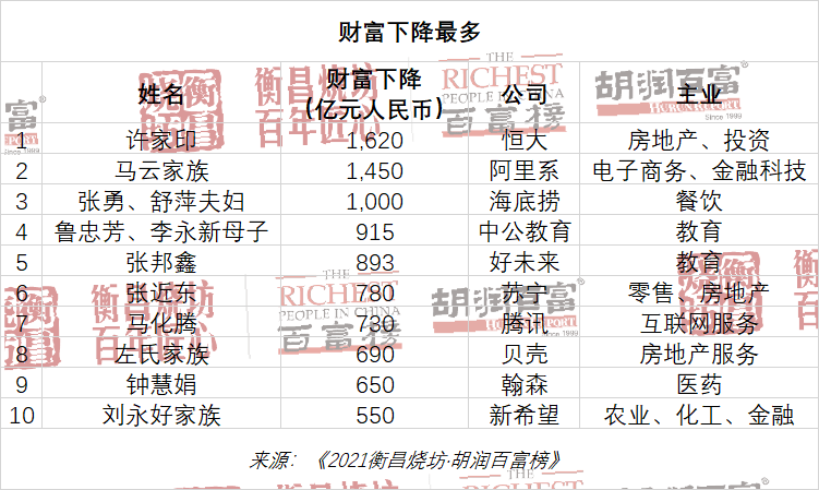 “从百富榜能看出反垄断的影响,以及房地产、教育、猪肉、游戏行业今年下降。深陷债务危机的恒大许家印财富比去年下降 1,600 多亿至 730 亿,华夏幸福王文学财富比去年下降 400 多亿至 60 亿。减负政策背景下,好未来张邦鑫财富缩水近 900 亿至 57 亿,新东方俞敏洪财富缩水近 200 亿至 75 亿,高途教育陈向东去年财富 800 亿今年落榜。新希望刘永好家族财富缩水 500 多亿至 1,050 亿,牧原秦英林、钱瑛夫妇财富缩水 300 亿至 1,700 亿。马化腾财富比去年下降 700 多亿,下降两位至第四。”