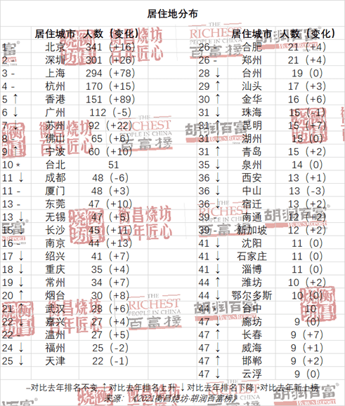 上海这两年增长迅速,今年又增加 78 人上榜,快速缩短了与深圳的差距,以 294 人位列全国第三。北京仍然是上榜企业家最多的城市,有 341 人居住于北京,比去年增加 16 人。深圳以 301 人保持第二,增加 26 人。杭州以 170 人保持第四,增加 15 人。香港以 151 人位列第五,增加 89 人。广州以 112 人位列第六,减少 5 人。苏州以 92 人位列第七,增加 22 人。前七大城市占总人数的一半,北深上占三分之一。