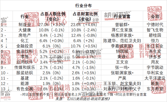 “从百富榜能看出碳中和‘3060’目标驱动下,新能源相关产业今年增长迅速;智能汽车和手机需求推动下,半导体行业增长;疫情之下,生物科技行业增长;北京冬奥会影响下,体育相关产业增长。今年财富增长最多的前 10 位企业家中,8 位和新能源有关,以电动汽车 6 位为主,也包括光伏 2 位,其他 2 位从事娱乐行业。对比两年前新冠疫情爆发之前,大健康、化工和食品饮料行业增长较快。”