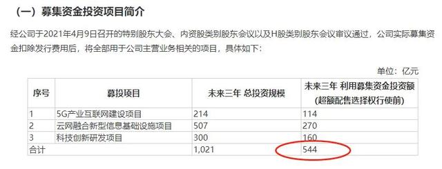 本次募资未来的使用预计为544亿元,也被认为是IPO拟募集资金金额。募资将用于5G产业互联网、云网融合、科技创新研发等项目。