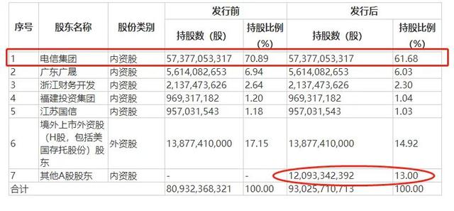 从股本情况来看,本次发行120.93亿股之前,控股股东中国电信集团持股70.89%,发行后摊薄持股比例将降至61.68%。