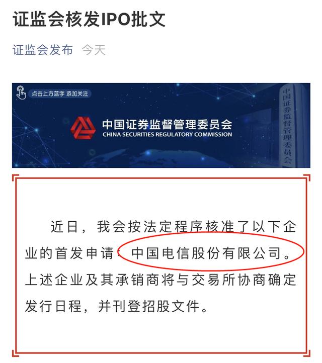 7月29日晚间,中国证监会公告,近日,证监会按法定程序核准了以下企业的首发申请:中国电信股份有限公司。上述企业及其承销商将与交易所协商确定发行日程,并刊登招股文件。将在上交所主板上市。